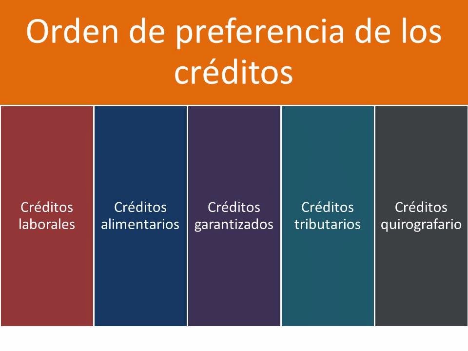 Existe un orden de preferencia en el pago de los créditos, esto es, que los créditos son pagados según el orden establecido hasta donde alcancen los bienes del insolvente. El orden de prelación o de pago establecido en el Artículo 42 de la Ley General del Sistema Concursal es el siguiente: